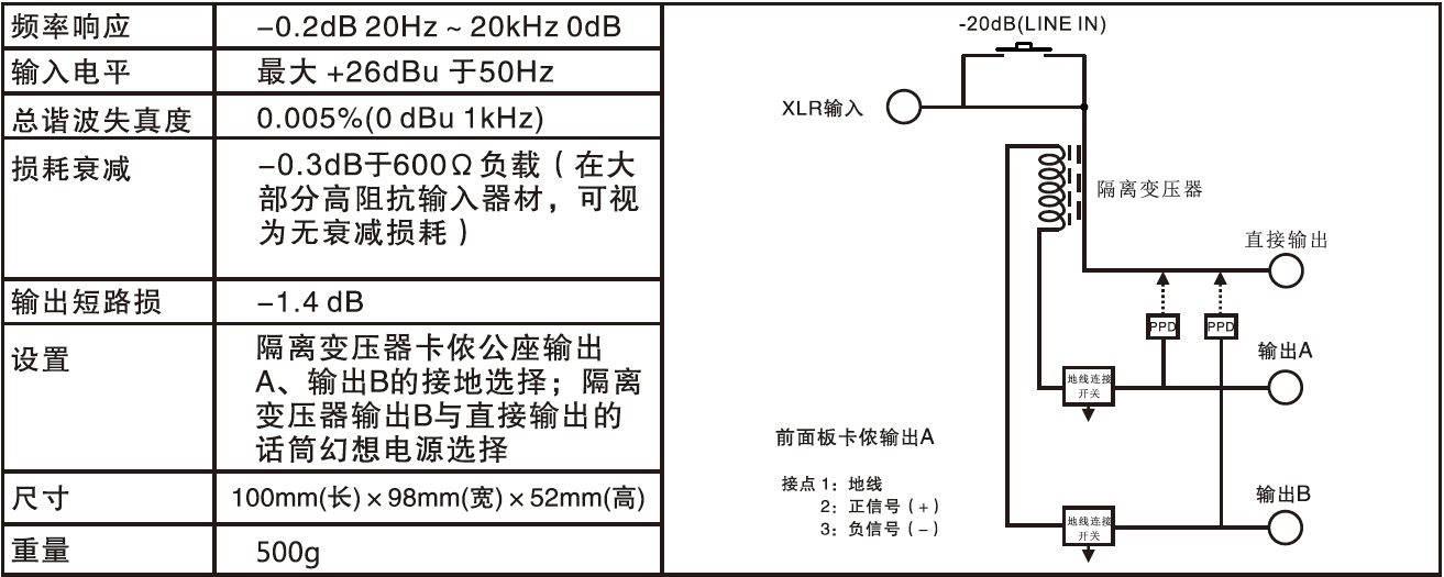 前麵板設置: XLRM-3直接輸出 XLRF-3話筒輸入 -20dB開關